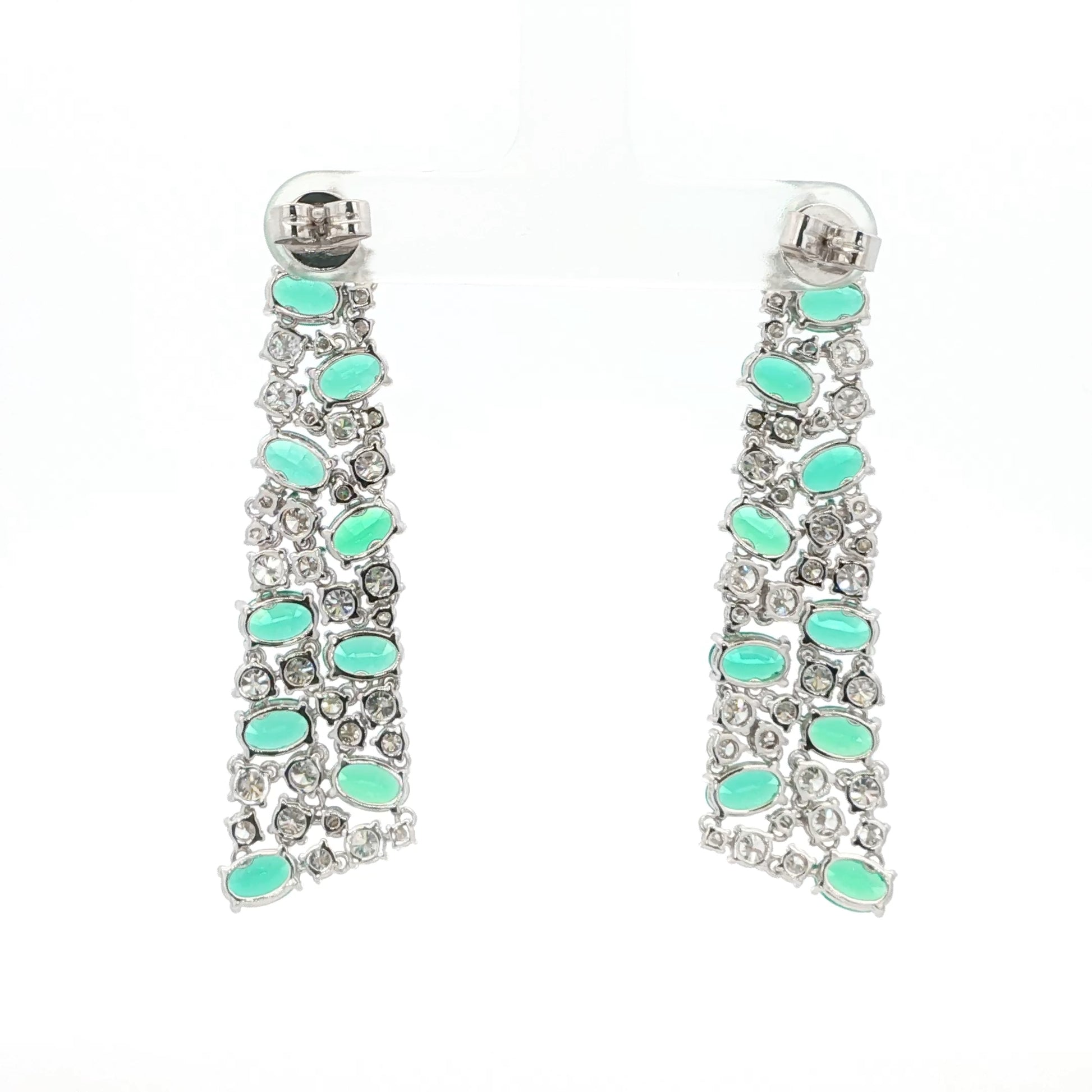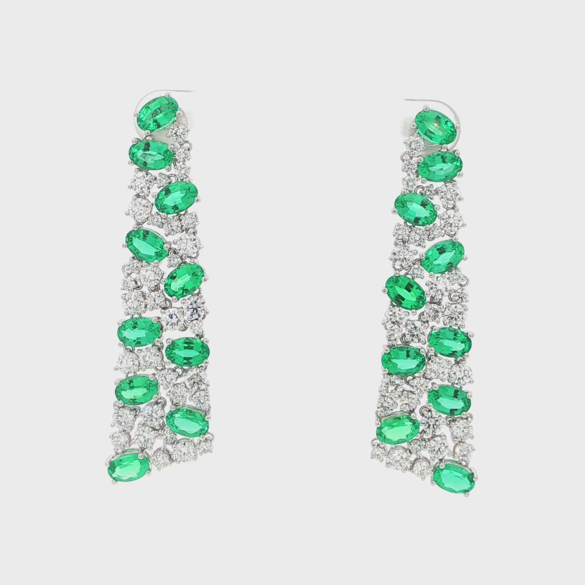These captivating earrings feature vibrant oval-cut emeralds paired with brilliant round diamonds, creating a stunning contrast. Crafted in 18K white gold, these earrings are perfect for adding a touch of elegance to any outfit, making them a must-have accessory for both special occasions and everyday wear.