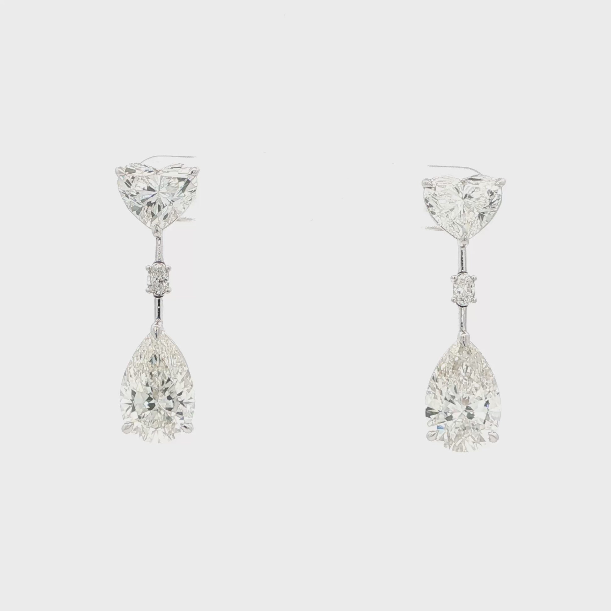 These exquisite drop earrings feature a stunning trio of heart, oval, and pear-cut Lab-Grown Diamonds, elegantly crafted in 18K white gold. Each earring showcases three captivating stones cascading down, with a large heart at the top, a small oval in the centre, and a large pear drop at the end, creating a harmonious blend of shapes that exude sophistication.