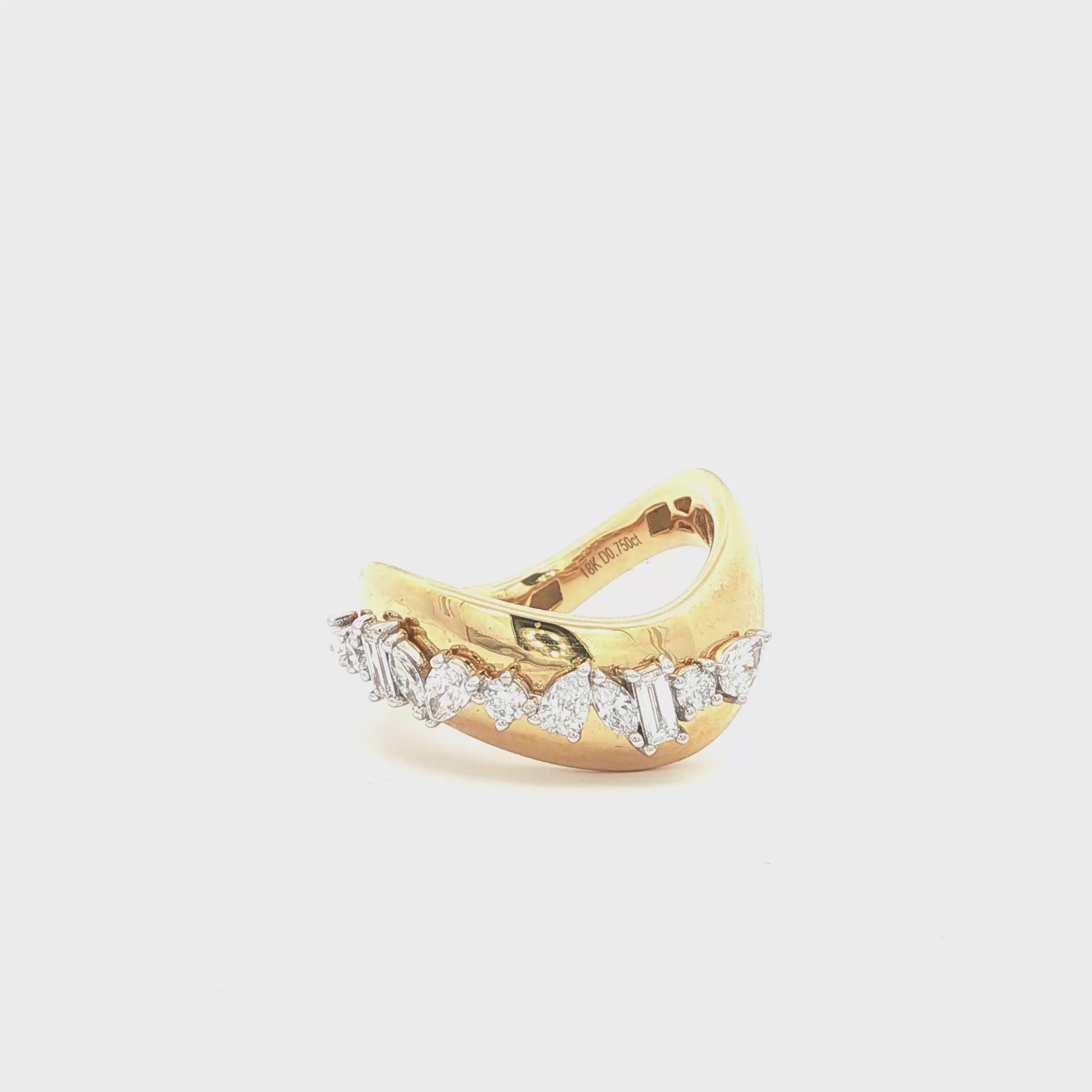 Elevate your ring stack with this stunning 18K Yellow Gold ring, showcasing a cascading pattern of multi-shape lab-grown diamonds - pear, marquise, baguette, and round. Its bold asymmetrical design offers a unique sparkle, making it a standout piece for any occasion.