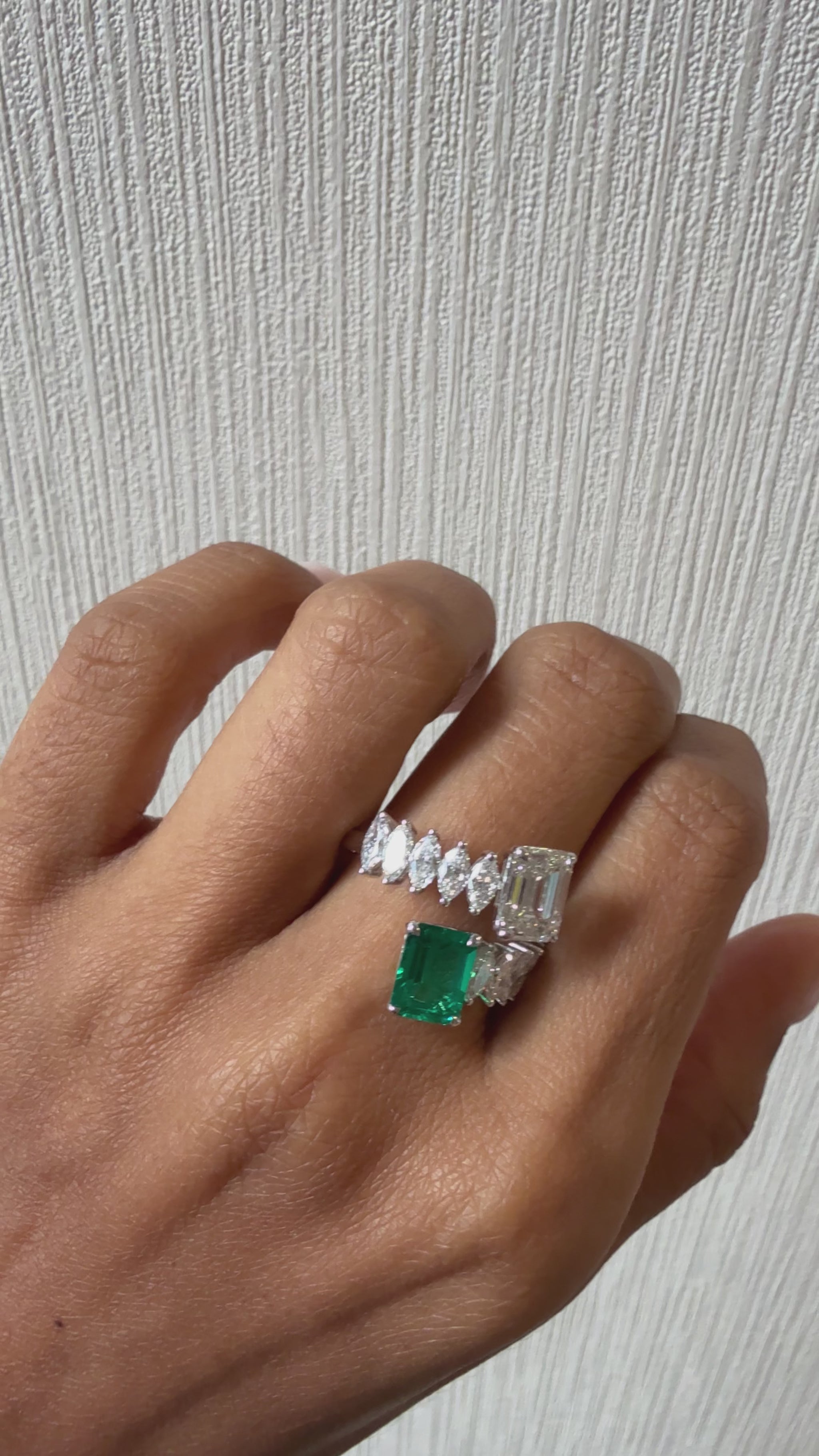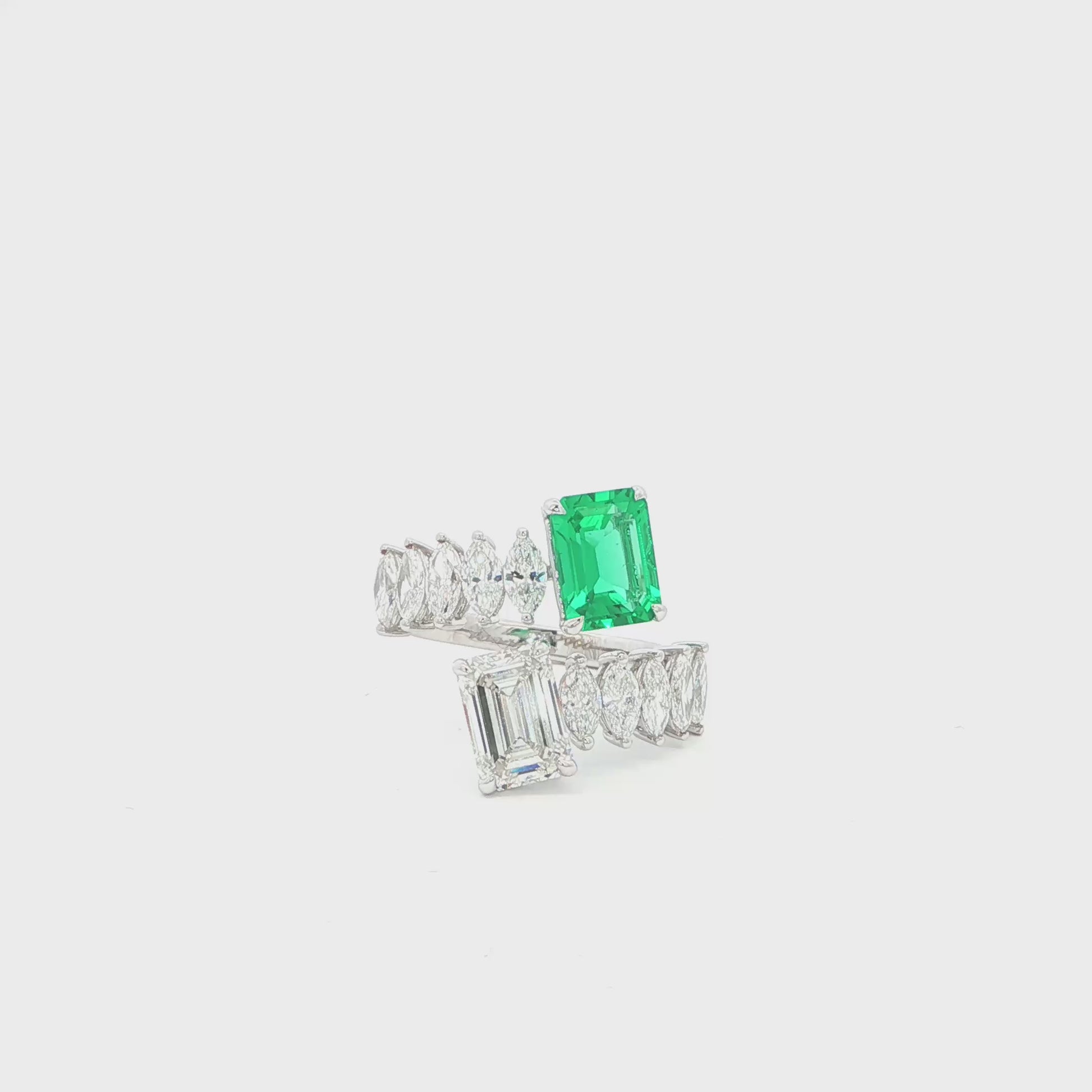 This stunning bypass ring features a captivating design crafted in 18K White Gold, showcasing an exquisite emerald. The elegant band is adorned with a seamless line of sparkling lab-grown marquise diamonds, adding a touch of sophistication and brilliance to the piece. Perfect for any occasion, this ring embodies modern elegance and individuality, making it a remarkable addition to your jewellery collection.