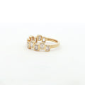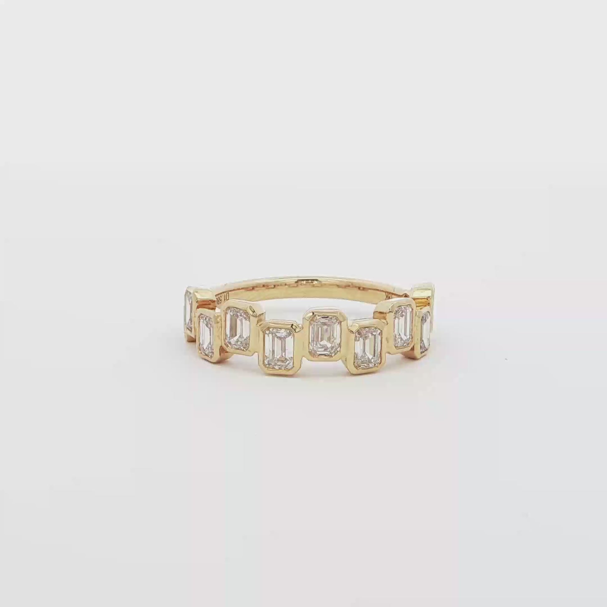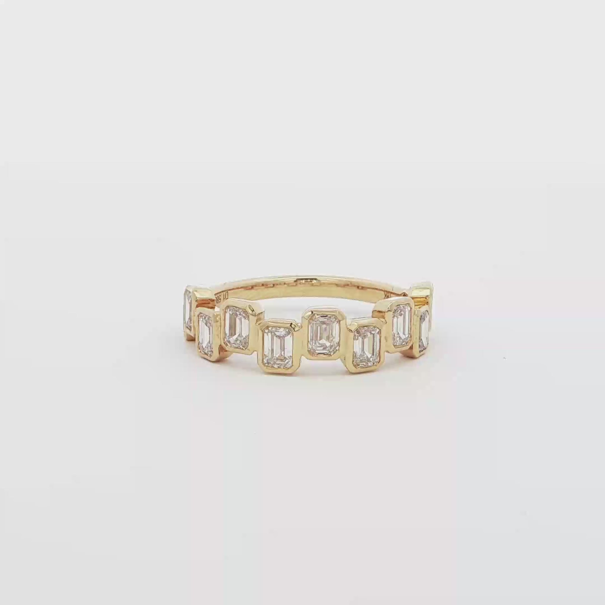 18K Yellow Gold half-eternity ring featuring bezel-set emeralds in a playful high-low pattern. A modern twist on the classic eternity band, designed for effortless sparkle and everyday wear.